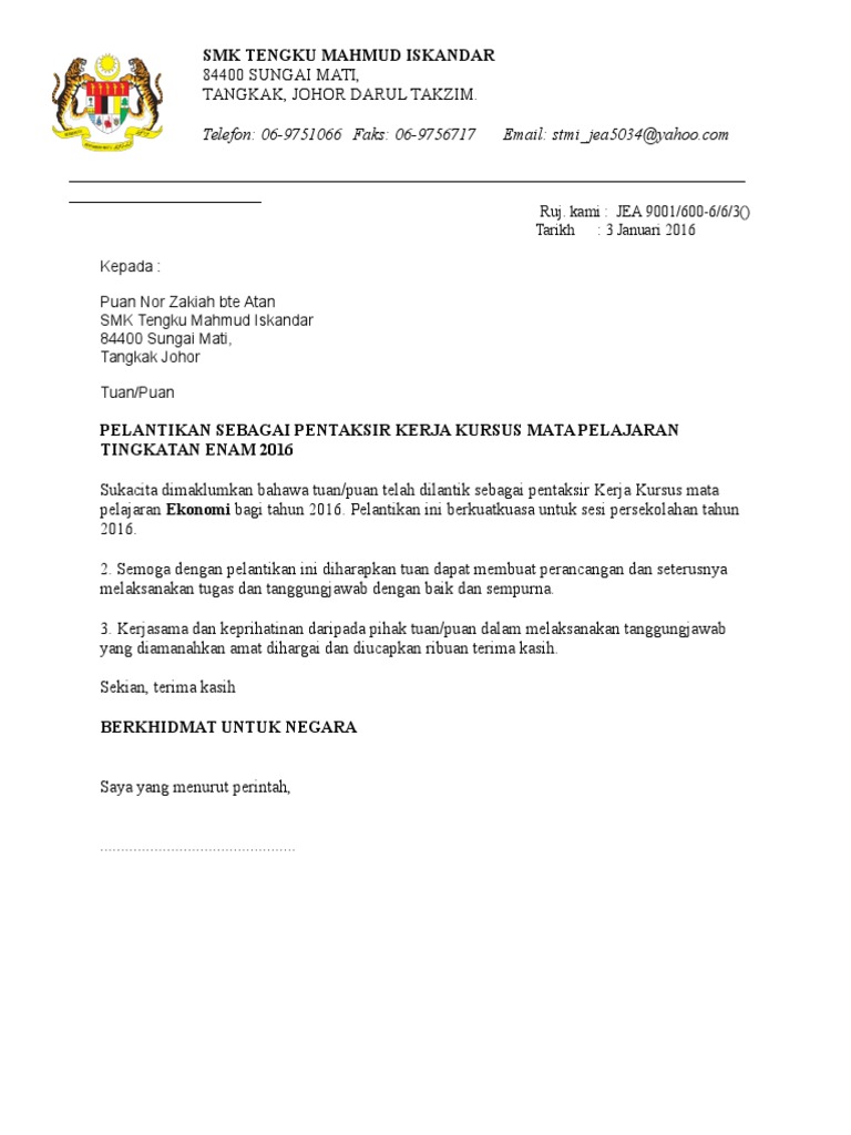 . ١٠ ذو الحجة ١٤٤٢ هـ. Contoh Surat Lantikan Jawatankuasa Sekolah Surat Permohonan Perubahan Nomenklatur Jabatan 2 Surat Kiriman Rasmi 1 Surat Plbs Bm 2014 Akuan Terima Surat Lantikan Guru Kelas Nilam 2012. Apr 24 2022 contoh surat kontrak pekerja majikan swasta 2021 portal cikgu.